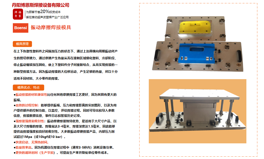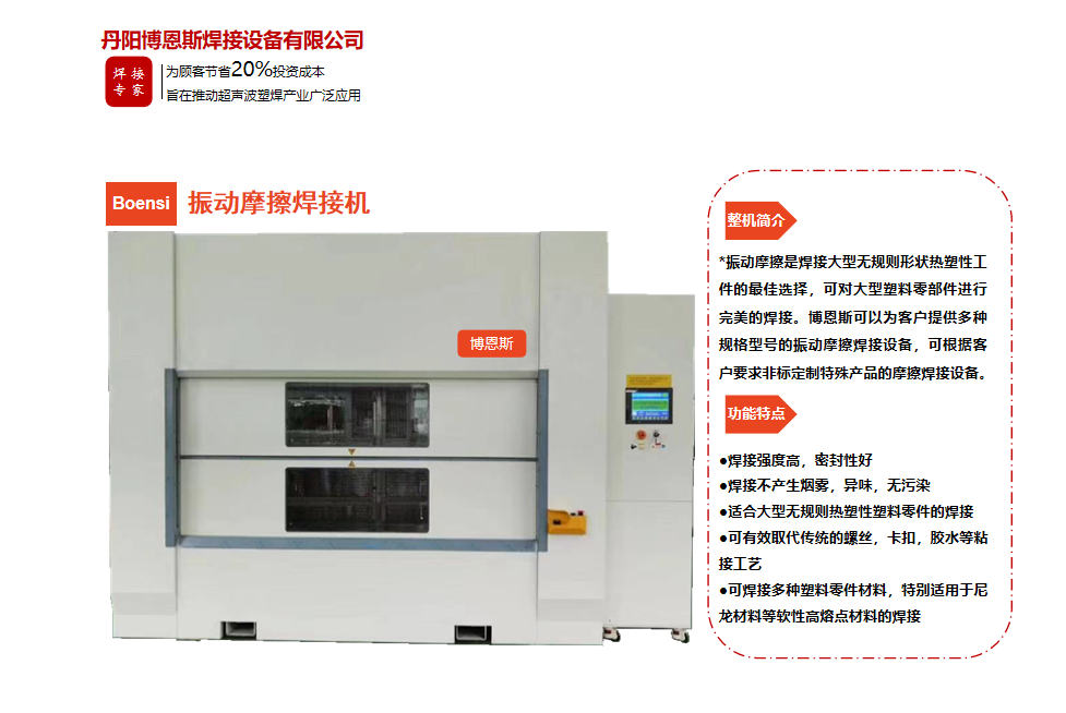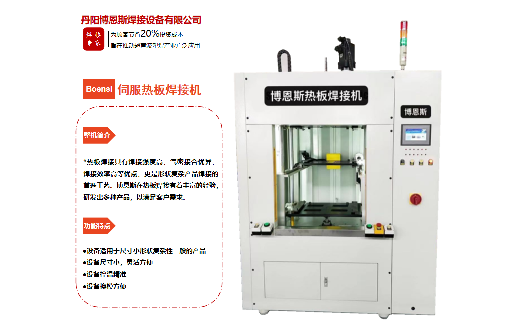 丹陽博恩斯焊接設備有限公司是塑料焊接領域集研發(fā)設計、生產制造、銷售服務為一體的企業(yè)。公司自成立以來堅持“以人為本”的理念,組織了一支強大的技術研發(fā)團隊,攜多年來積累的豐富經驗,并結合國際先進塑料焊接技術,根據市場需要,不斷開發(fā)具有核心競爭力的新產品。公司具有很強的非標機械研發(fā)、設計、生產能力,可為廣大客戶定制各類專用機械設備。公司設計生產的塑料焊接設備已廣泛應用于汽車、電子、家電、醫(yī)療器械、無紡布...
